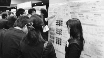| 3月27日12:00~17:00の時間に1号館記念講堂で114件のポスター発表が行われ、そのうち優秀ポスター賞にエントリーおよび審査対象となっている98件の内容・発表について審査が行われた。春期講演大会では過去最高のポスター発表件数であった。 |