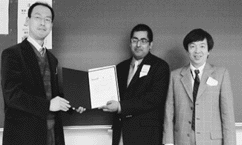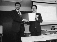| 若手研究者の活動の活性化とTMSとの国際交流促進を目的に2006年より設けられた Joint JIM/TMS Young Leader International Scholar Program として、TMSから派遣された代表者 Sandip P. Harimkar氏が一般講演「アモルファス・準結晶」、Nitin Chopra氏が一般講演「ナノ・萌芽材料」の中で Young Leader International Scholar講演発表後、座長より賞状が授与された。 |