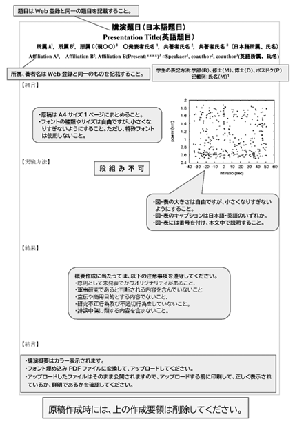 - ・講演申込と同時にPDFファイルをアップロードして、講演概要を提出して下さい。(※同時に行わない場合は、講演申込は受理されません)